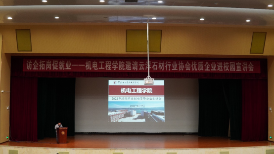 随后,云浮市科特机械有限公司总经理助理贺凤文、云浮市利机石材有限公司副总经理陆庆云依次进行了宣讲。他们通过播放宣传片、PPT等方式,从公司概况、福利待遇、企业文化、职业发展、食宿环境等方面给同学们作了详细介绍,并向同学们推荐介绍了微信公众号,方便同学们进一步了解相关信息。