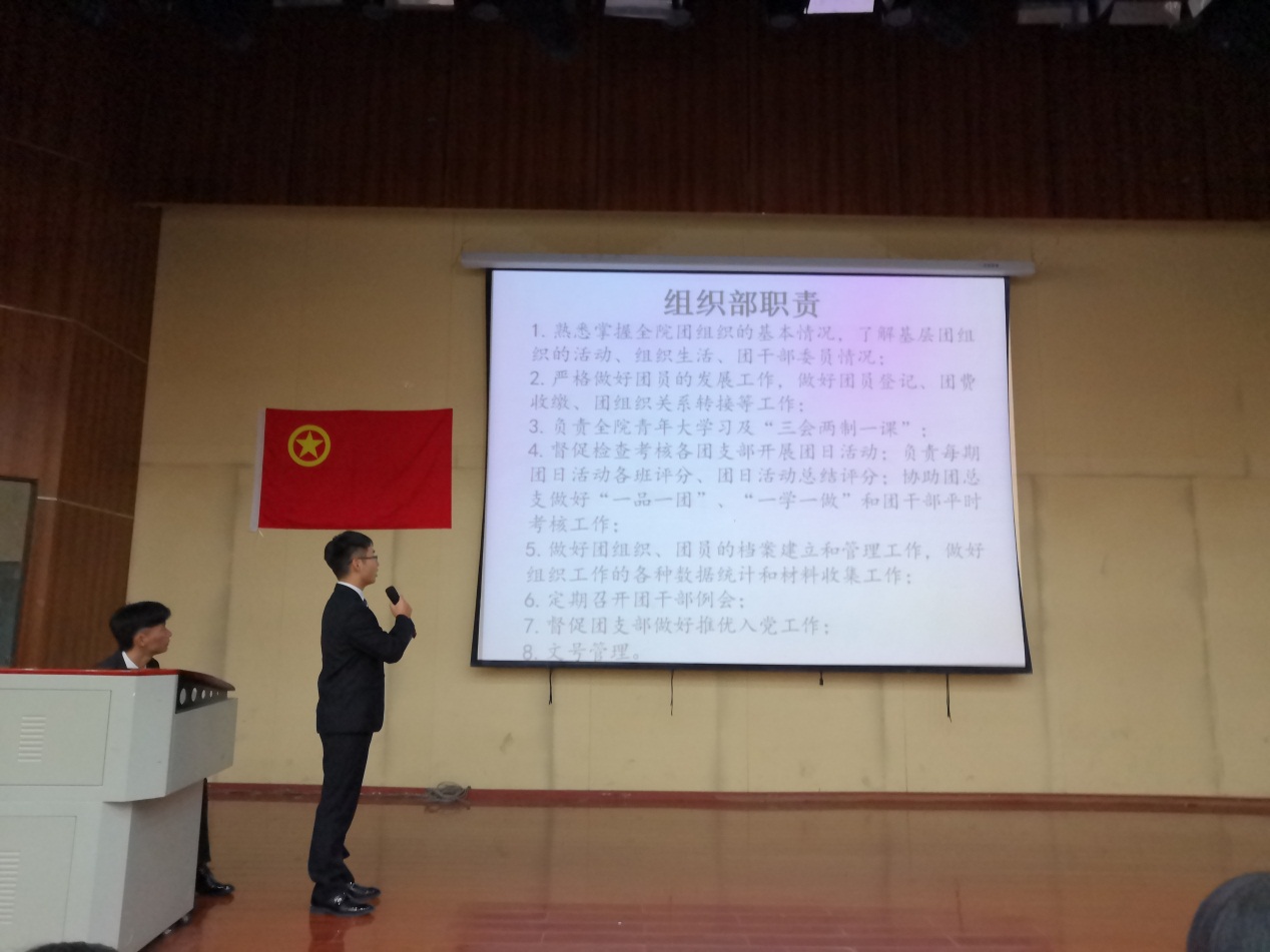 活动伊始,全体成员齐唱共青团团歌《光荣啊,中国共青团》。随后,党总支书记王春莲老师为大会致辞,她强调,学生干部是学院、学校的骨干,是师生沟通的桥梁,身上担负着重要责任,要求学生干部们在生活中关心同学服务同学,在工作中要严格履行规章制度,及时完成交办工作,在学习上勤奋努力,起到榜样带头作用。学生干部还需要不断学习总结,提高自己的综合素质能力,力争做到老师同学的信赖。接着,团总支副书记何晓洪同学和学生会执行主席陈兴攀同学分别对团总支和学生会的职能进行解读,阐述了团总支、学生会和团支部、班级之间的对接关系。然后,陈立老师在总结中强调,学生干部应齐心协力,在党总支的领导下,在团总支的领导下,努力探索班团一体化工作模式,不断提高效率,高质量完成工作。学生干部还要不断强化个人的责任意识和提升办事能力,真正做到联系同学、深入同学、服务同学。最后由陈立老师带领全体学生干部重温入团誓词。