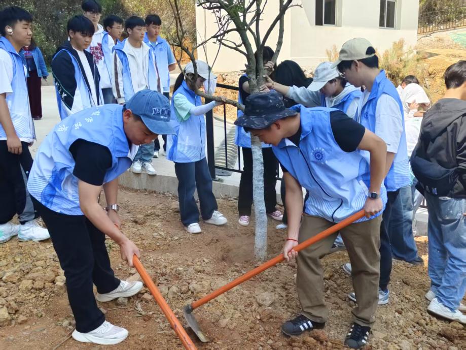 实践战场:东门隧道工程实训基地旁边,在校团委的带领下,学院志愿者们正投身于热火朝天的植树活动。抵达基地后,志愿者们迅速分组,默契协作。挥锹铲土的动作刚劲有力,扶正树苗的姿态小心翼翼,提水浇灌时脚步匆匆却又沉稳有序,每一个步骤都认真细致,一丝不苟。在众人齐心协力之下,一棵棵树苗稳稳扎根于沃土,在轻柔的春风中舒展身姿,为实训基地披上了一层充满希望的新绿。