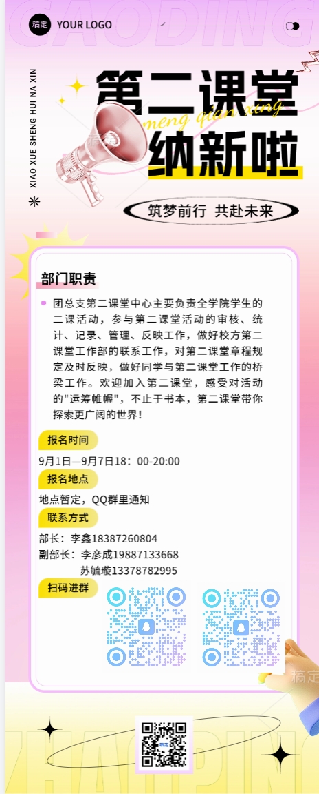 第二课堂中心不仅是连接学院和同学们的桥梁,更是一个让大家展现自我、施展才华的舞台。我们以热情和负责的态度,努力为同学们打造有趣、多样、有意义的课外活动环境。虽然力量有限,但我们希望为大家放出无限的光芒。来这里,拓展你的视野,丰富大学生活——第二课堂欢迎你!