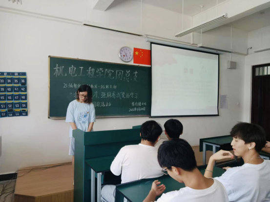 活动开始,在副班长胡倩的带领下,全体成员合唱《中国共产主义青年团团歌》,并重温入团誓词。随后,团小组成员罗宗富、袁撰以技能成才,强国有我为主题,对狼牙山五壮士和张桂梅校长等党史故事进行了分享。他们认为,从狼牙山五壮士到张桂梅校长,从半条棉被丰碑,这些党史故事无一不是崇高信仰、高尚品德的生动写照。他们呼吁全班同学要积极学习党史故事,学习榜样精神,跟随榜样的脚步,衷心拥护党的领导和社会主义制度,深植爱国之情、砥砺报国之志,努力学习知识技能,切实履行请党放心,强国有我的庄严承诺。
