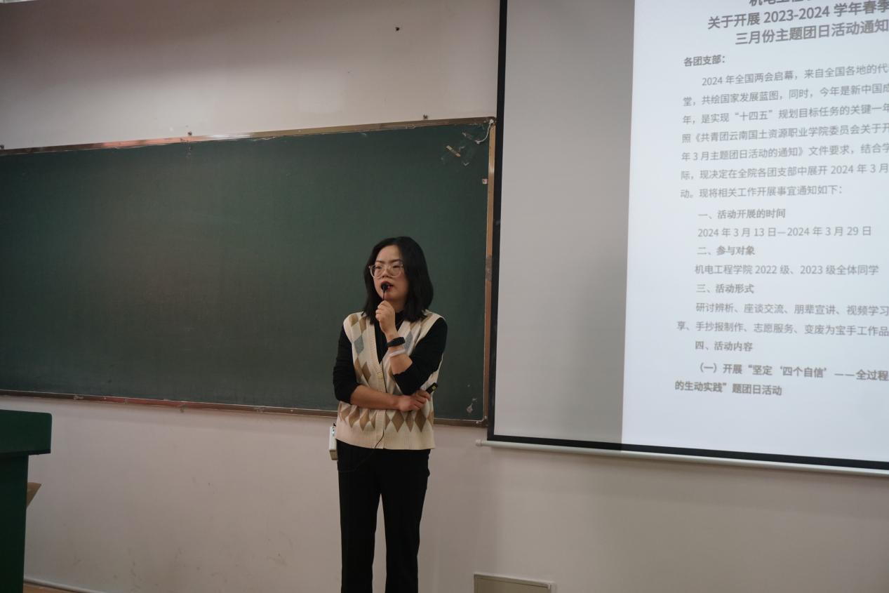 会议开始,马玲老师向与会人员讲解了3月份团日活动的主题以及开展的具体形式。她指出以往团日活动中各支部存在的共性问题,如理论学习形式化、学生参与积极性不高、部分支部开展效果不佳等,要求各支部结合二课活动,创新会议形式、提高活动质量与活动效果。