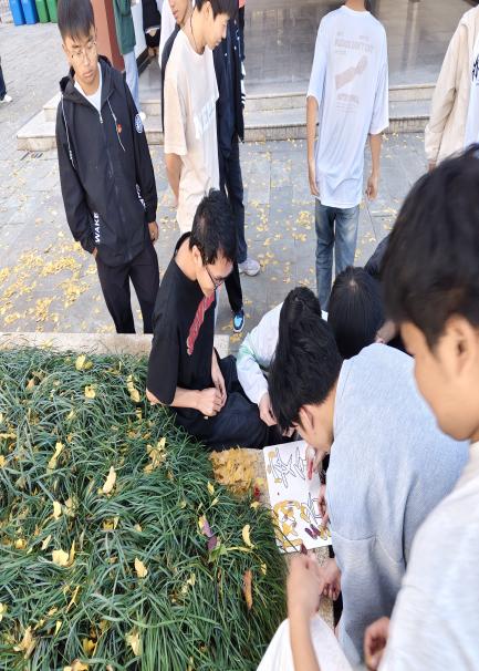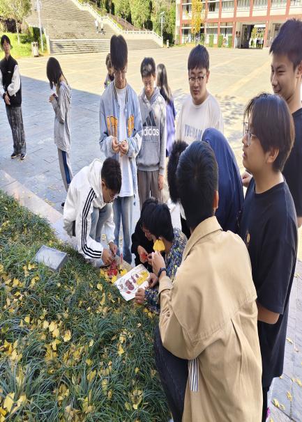 班级纪检委员余治鹏讲解活动规则:1、将班级同学分为六组,每组十人。各组依次离开教室,前往国土广场。2、五分钟之内,在国土广场寻找并收集落叶。3、使用收集的落叶创作一幅图画。4、依次展示各组创作的图画,并分享与之相关的故事。