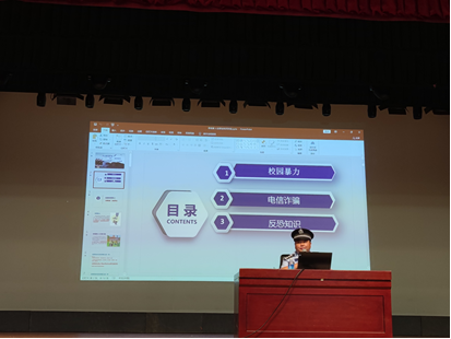 陈立老师首先动员所有2019级同学在外出实习之前,要认真学习安全常识,提高防范意识,保障好在校外实习期间的生命财产安全。陈警官首先从国内发生的暴力案件开始讲起,进一步阐释校园暴力的危害性,以及相关的法律处罚规定,警示同学们树立法律意识,通过合理合法的途径来处理纠纷。其次,介绍了网络诈骗的历史发展脉络、主要诈骗手段、近期案件,提醒同学们在遭遇刷单、裸聊、假冒公检法系统等情况时,听到银行卡、账号、转账、打款等关键词要及时挂断电话,牢记“天上不会掉馅饼”、“公检法系统不通过电话办案”两条原则,防止受骗。最后简要介绍了反恐防暴知识,在遭遇劫持、枪击、砍杀、纵火等事件时,要沉着镇静、寻找遮蔽物、及时逃离现场等具体应对措施。