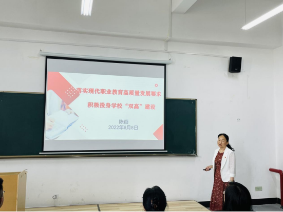68日下午,党委副书记、校长陈颖以《落实现代职业教育高质量发展要求 积极投身学校“双高”建设》为题,结合今年会jinnianhuicom的实际情况,给今年会jinnianhuicom全体教职工讲授“双高”建设专题党课,今年会jinnianhuicom党总支书记王春莲主持。