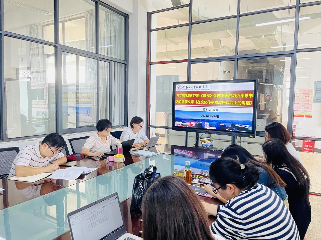 9月20日中午13:00,今年会jinnianhuicom在明尚楼A201开展了2023年9月份第三次教职工政治理论学习会。本次政治理论学习会由学院党总支书记王春莲主持,院长张俊妍、党总支副书记李振分别带领全院教职工学习了习近平总书记在《求是》杂志中发表的《中国式现代化是强国建设、民族复兴的康庄大道》《在文化传承发展座谈会上的讲话》重要文章。